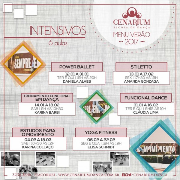 Mais intensivos especialmente elaborados para você dançar conosco. Confira: • Intensivos - 6 aulas 12/01 a 31/10 – Power Ballet (Ter/Qui) 19 às 20h – Daniele Alves 13/01 a 17/02 – Stiletto (Sexta) 17h30