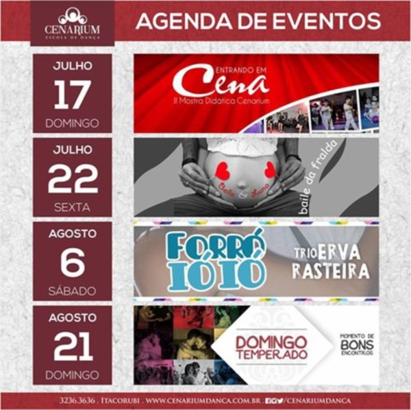 O nosso segundo semestre começa com muitos eventos para você sorrir e dançar mais! 17.07 - Entrando Em Cena | II Mostra Didática Cenarium Local: Teatro Pedro Ivo Horário: 17h Ingressos: Bônus antecipado na secretaria