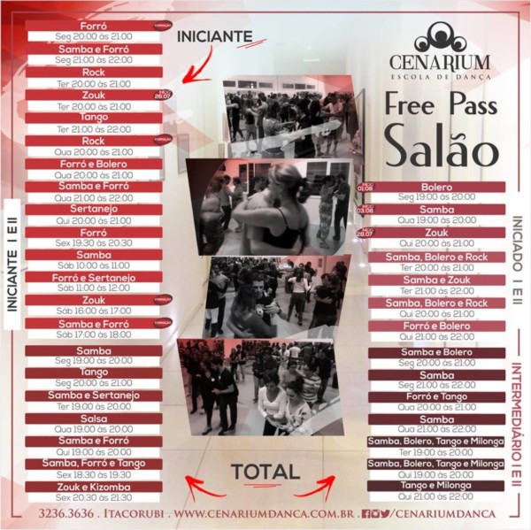 Para dançar mais, aproveite o nosso Free Pass Salão. São duas categorias para você escolher: • Free Pass Iniciante, garante acesso livre as turmas Iniciante I e II. • Free Pass Salão Total, você